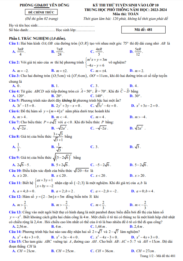 Đề thi thử Toán vào lớp 10 năm 2023 – 2024 phòng GD&ĐT Yên Dũng – Bắc Giang