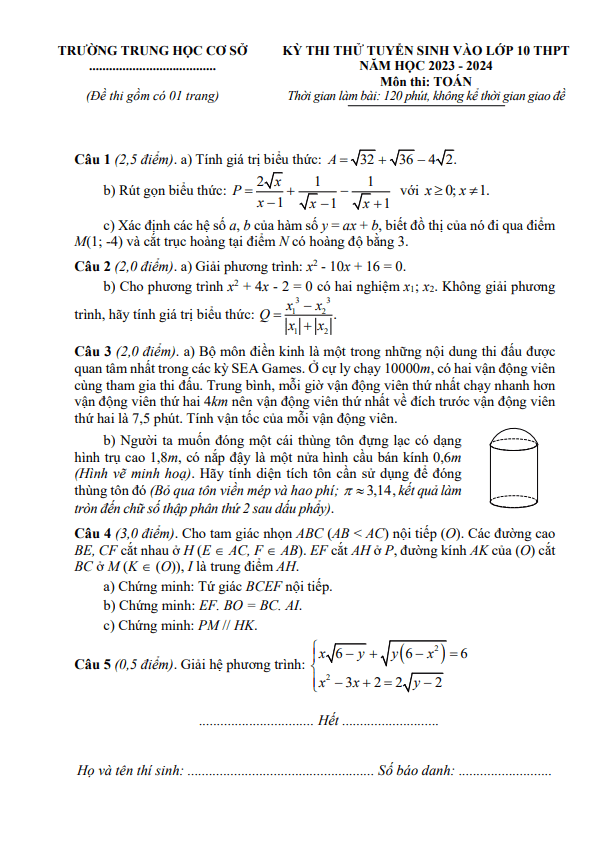Đề thi thử Toán vào 10 lần 2 năm 2023 – 2024 trường THCS Nguyễn Thiện Thuật – Hưng Yên