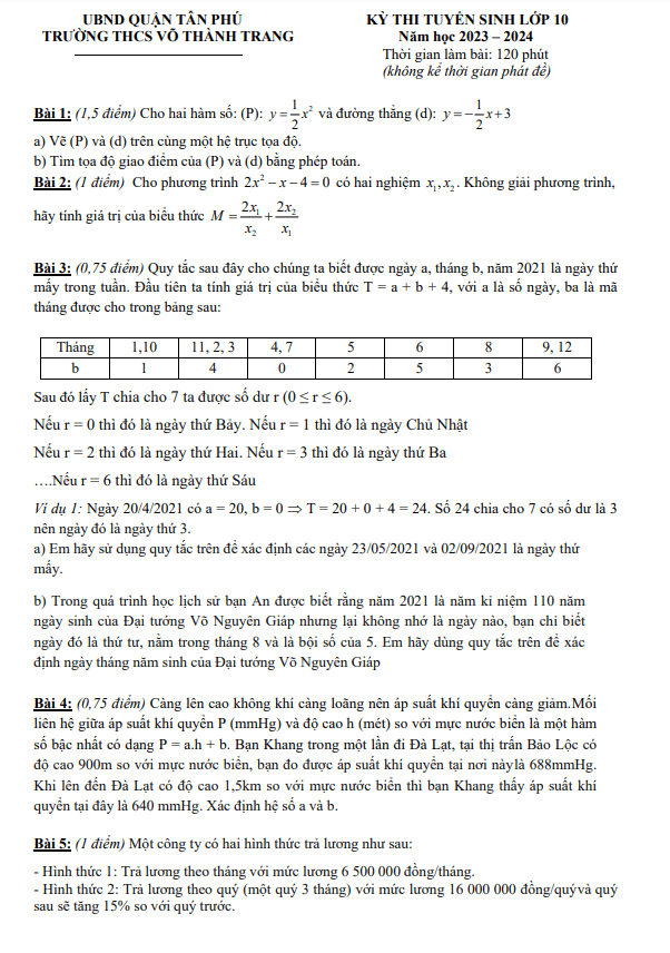 Đề thi thử Toán vào lớp 10 năm 2023 – 2024 trường THCS Võ Thành Trang – TP HCM