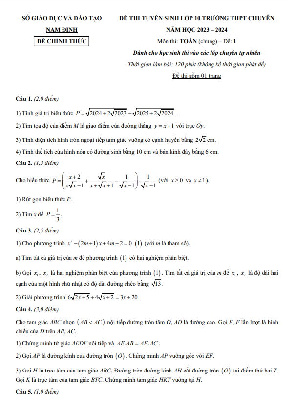 Đề thi vào 10 chuyên môn Toán (chung – TN) năm 2023 – 2024 sở GD&ĐT Nam Định