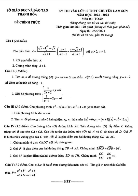 Đề thi vào 10 môn Toán (chung) năm 2023 – 2024 trường chuyên Lam Sơn – Thanh Hóa
