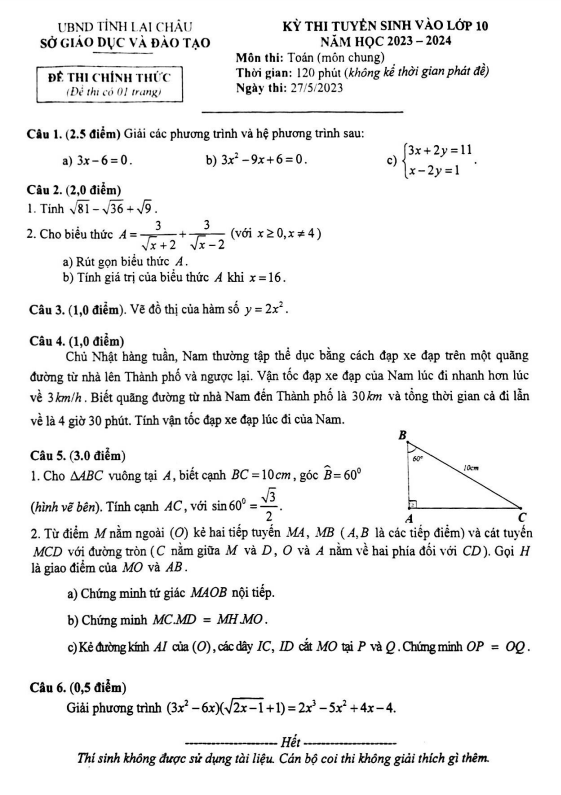 Đề thi vào lớp 10 môn Toán (chung) năm 2023 – 2024 sở GD&ĐT Lai Châu