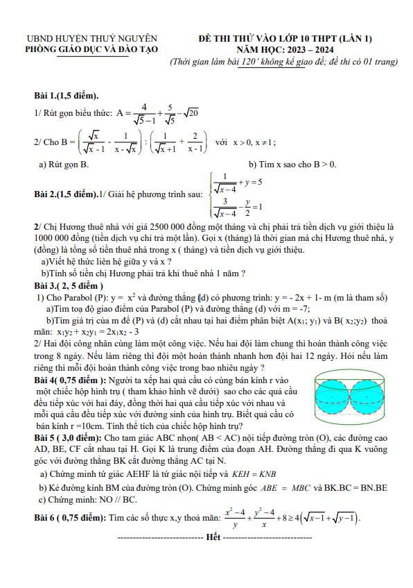 Đề thi thử Toán vào 10 lần 1 năm 2023 – 2024 phòng GD&ĐT Thủy Nguyên – Hải Phòng