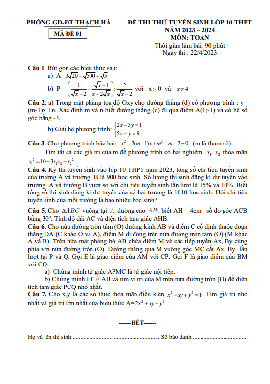 Đề thi thử Toán vào lớp 10 năm 2023 – 2024 phòng GD&ĐT Thạch Hà – Hà Tĩnh