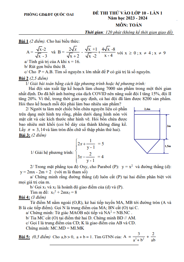 Đề thi thử Toán vào 10 lần 1 năm 2023 – 2024 phòng GD&ĐT Quốc Oai – Hà Nội