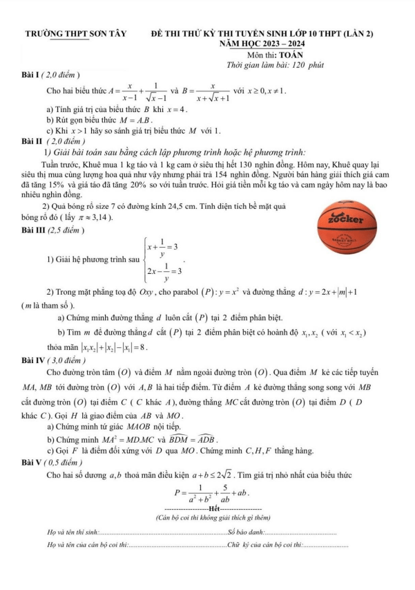 Đề thi thử Toán vào lớp 10 lần 2 năm 2023 – 2024 trường THPT Sơn Tây – Hà Nội