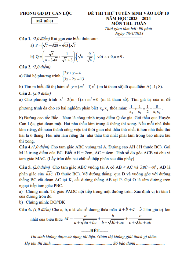 Đề thi thử Toán vào lớp 10 năm 2023 – 2024 phòng GD&ĐT Can Lộc – Hà Tĩnh