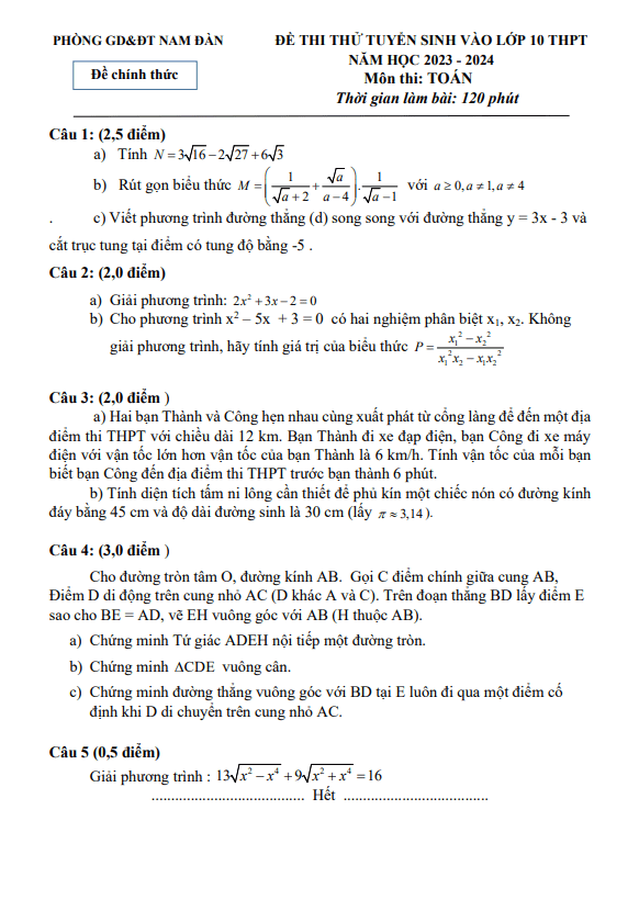 Đề thi thử Toán vào lớp 10 năm 2023 – 2024 phòng GD&ĐT Nam Đàn – Nghệ An