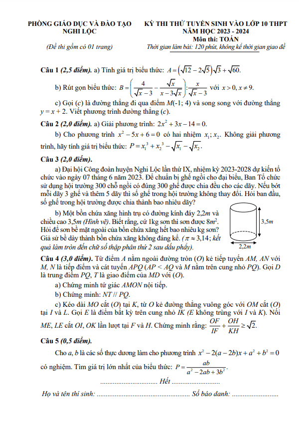 Đề thi thử Toán vào lớp 10 năm 2023 – 2024 phòng GD&ĐT Nghi Lộc – Nghệ An
