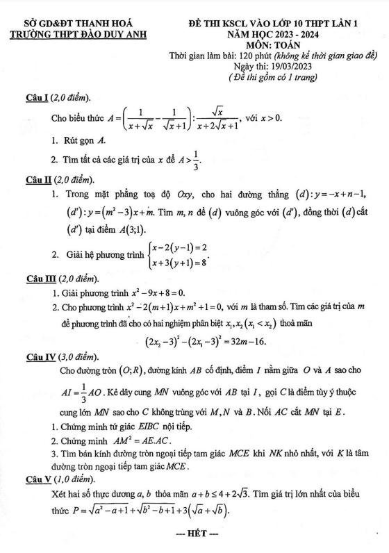 Đề KSCL Toán vào 10 lần 1 năm 2023 – 2024 trường THPT Đào Duy Anh – Thanh Hóa