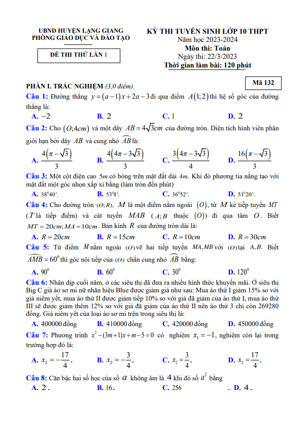 Đề thi thử Toán vào 10 lần 1 năm 2023 – 2024 phòng GD&ĐT Lạng Giang – Bắc Giang
