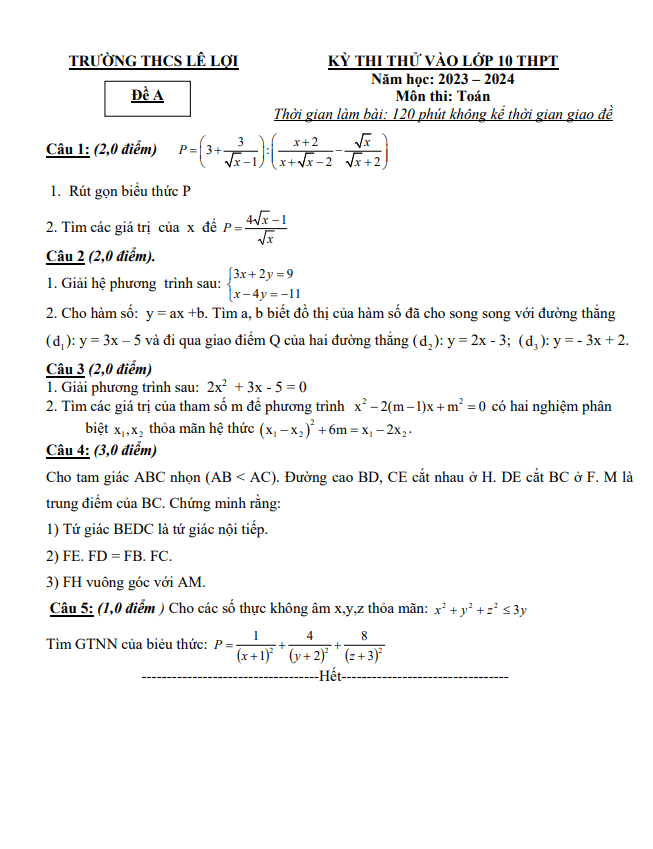 Đề thi thử Toán vào lớp 10 năm 2023 – 2024 trường THCS Lê Lợi – Thanh Hóa