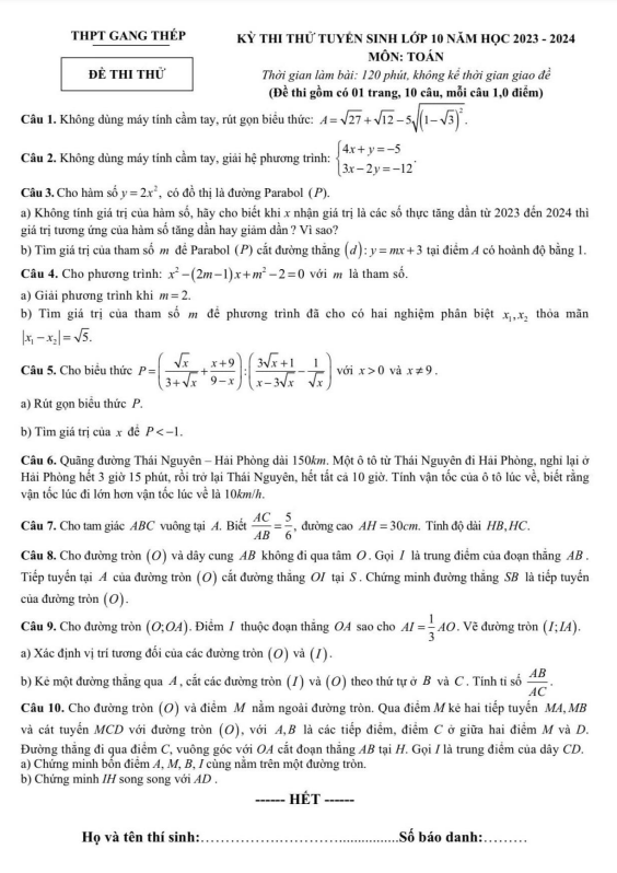 Đề thi thử Toán vào lớp 10 năm 2023 – 2024 trường THPT Gang Thép – Thái Nguyên