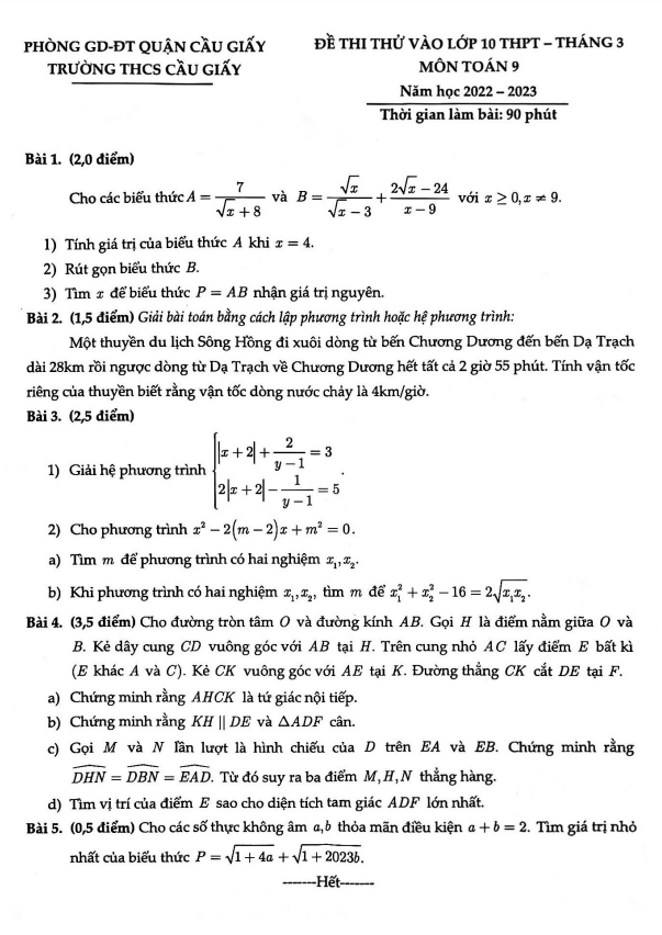 Đề thi thử Toán vào lớp 10 tháng 3 năm 2023 trường THCS Cầu Giấy – Hà Nội