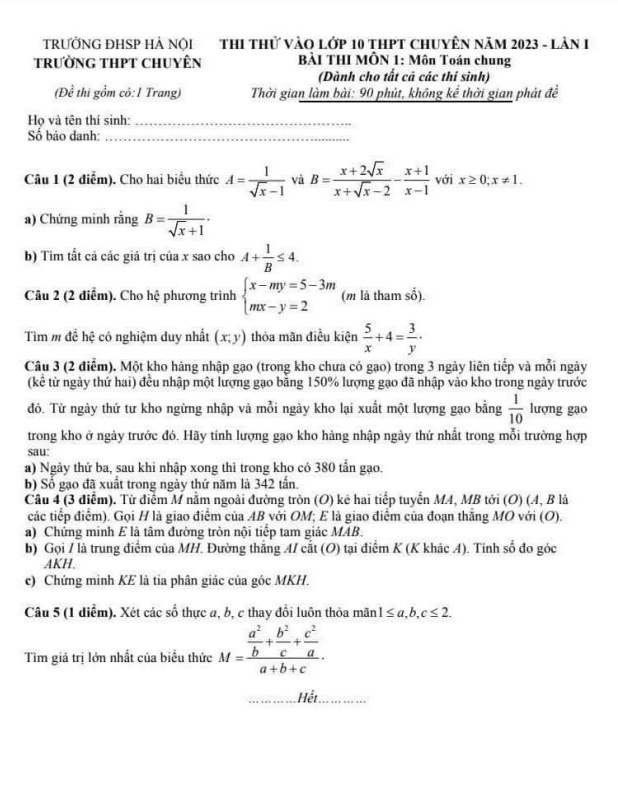 Đề thi thử vào 10 chuyên 2023 lần 1 Toán chung trường THPT chuyên ĐHSP Hà Nội