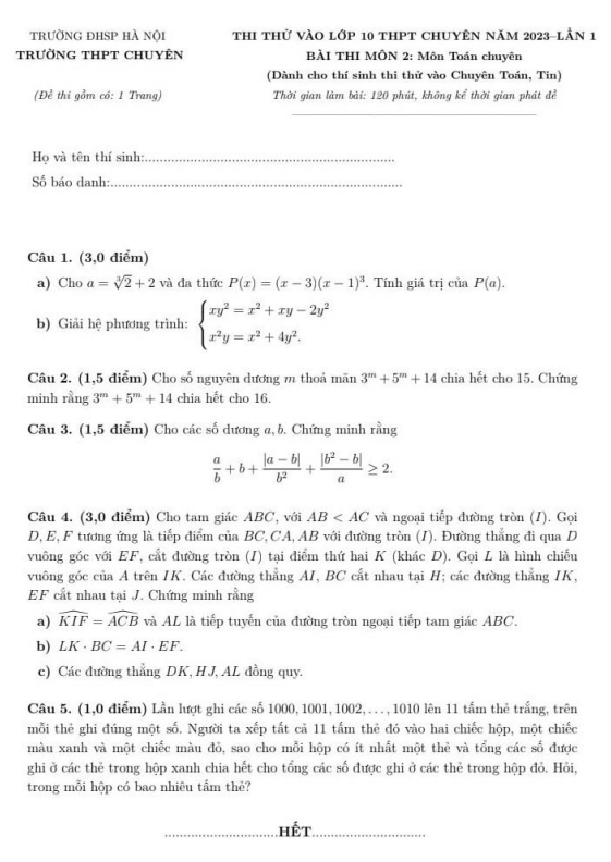 Đề thi thử vào 10 chuyên 2023 lần 1 Toán chuyên trường THPT chuyên ĐHSP Hà Nội