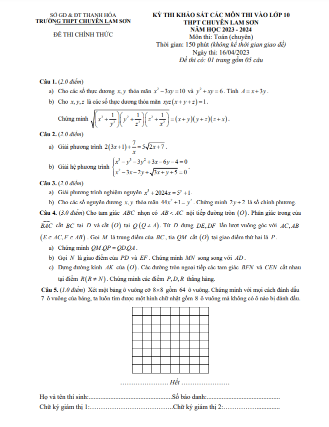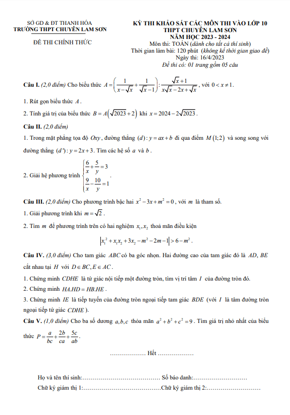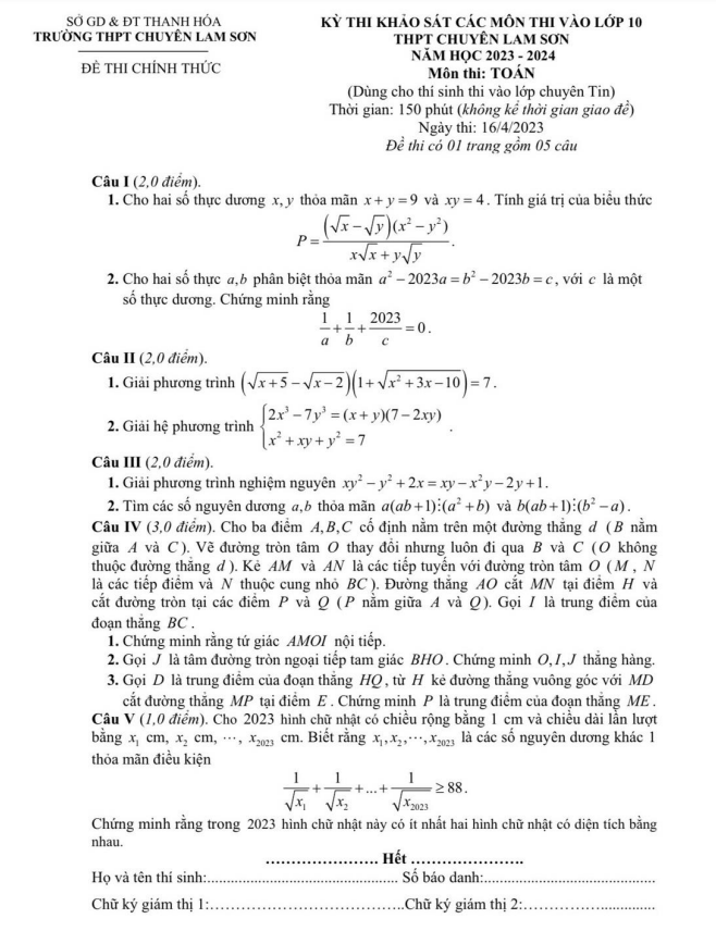 Đề khảo sát Toán (chuyên) vào 10 năm 2023 – 2024 trường chuyên Lam Sơn – Thanh Hóa