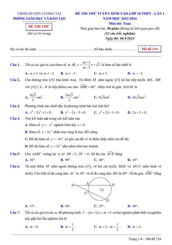 Đề thi thử Toán vào 10 lần 1 năm 2023 – 2024 phòng GD&ĐT Lương Tài – Bắc Ninh