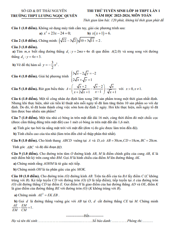 Đề thi thử Toán vào 10 lần 1 năm 2023 – 2024 trường Lương Ngọc Quyến – Thái Nguyên