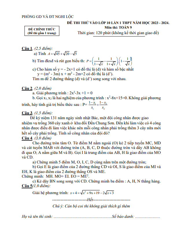 Đề thi thử Toán vào 10 lần 1 năm 2023 – 2024 trường THCS Nghi Phong – Nghệ An