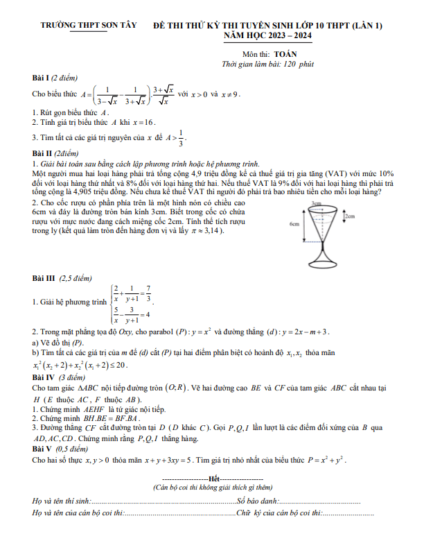 Đề thi thử Toán vào lớp 10 lần 1 năm 2023 – 2024 trường THPT Sơn Tây – Hà Nội