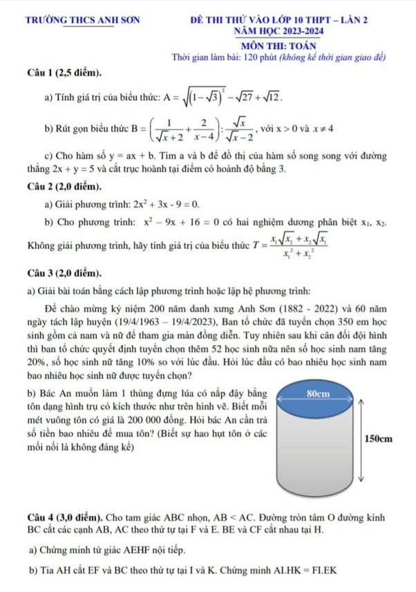 Đề thi thử Toán vào lớp 10 lần 2 năm 2023 – 2024 trường THCS Anh Sơn – Nghệ An