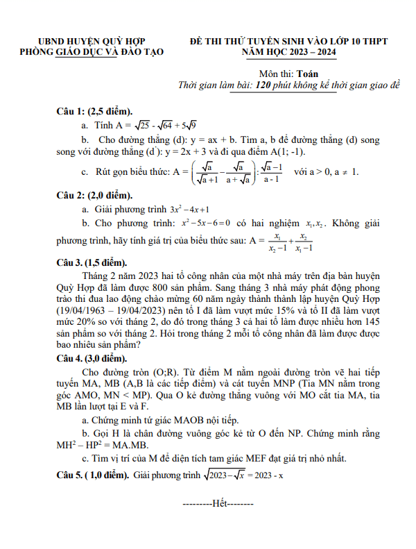 Đề thi thử Toán vào lớp 10 năm 2023 – 2024 phòng GD&ĐT Quỳ Hợp – Nghệ An