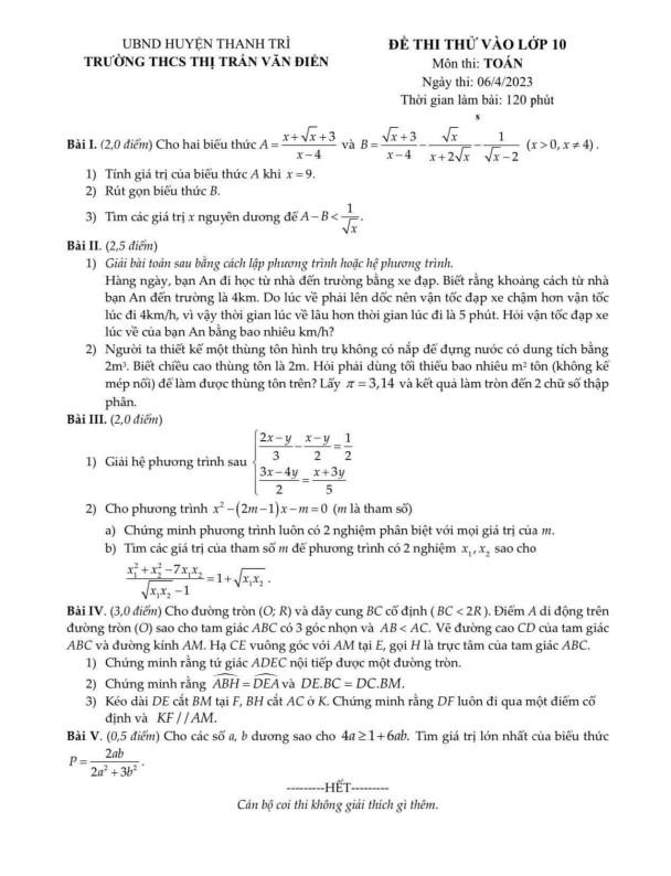Đề thi thử Toán vào lớp 10 năm 2023 trường THCS thị trấn Văn Điển – Hà Nội
