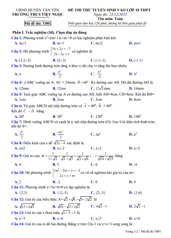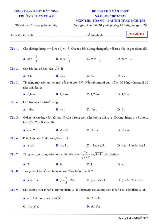 Đề thi thử vào THPT môn Toán năm 2022 – 2023 trường THCS Vệ An – Bắc Ninh