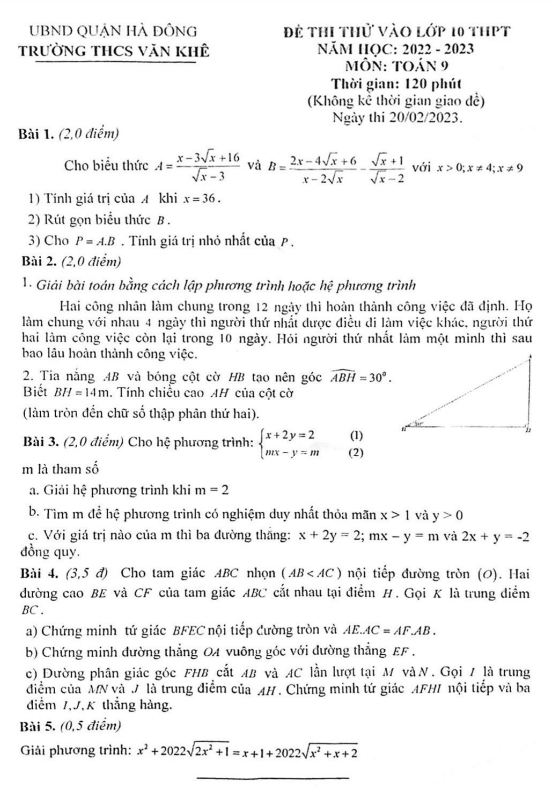 Đề thi thử Toán vào lớp 10 năm 2023 trường THCS Văn Khê – Hà Nội