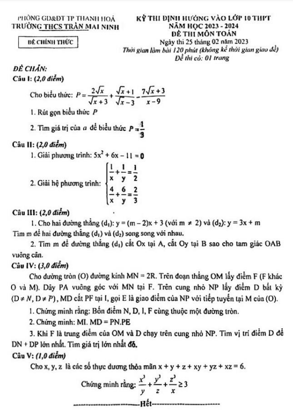 Đề Toán định hướng vào 10 năm 2023 – 2024 trường THCS Trần Mai Ninh – Thanh Hóa