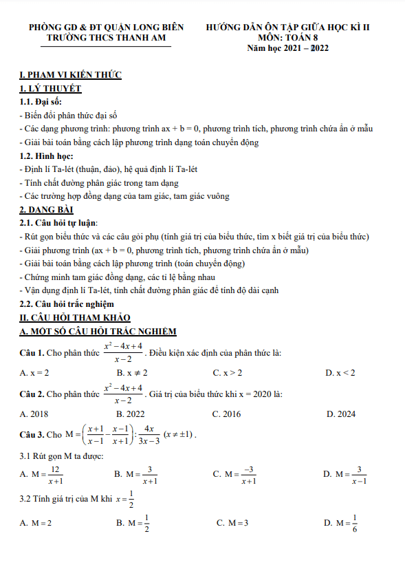 Hướng dẫn ôn tập giữa kì 2 Toán 8 năm 2021 – 2022 trường THCS Thanh Am – Hà Nội