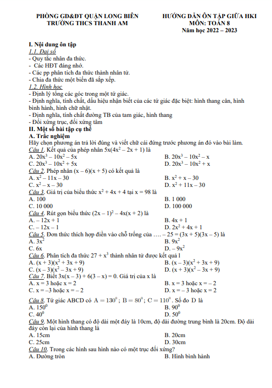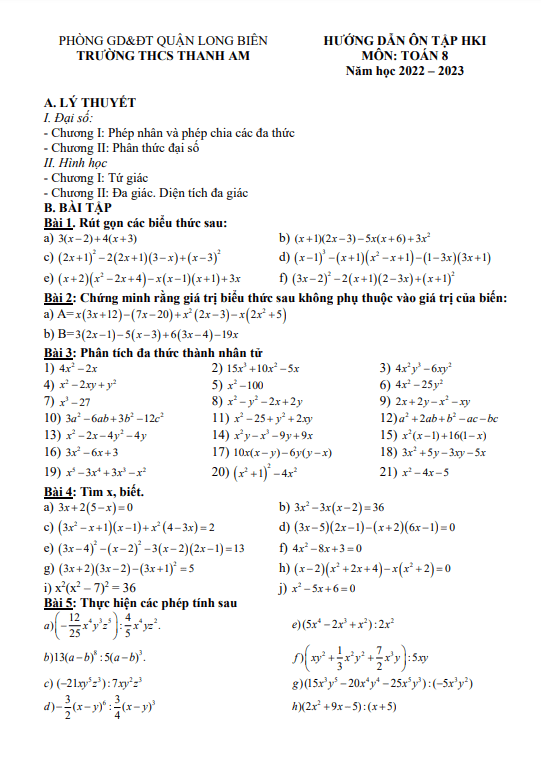 Hướng dẫn ôn tập giữa kì 1 Toán 8 năm 2022 – 2023 THCS Thanh Am – Hà Nội