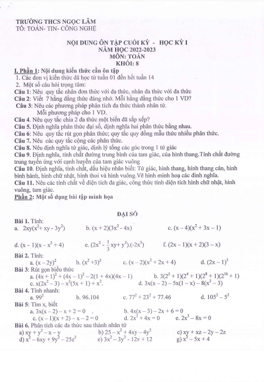 Đề cương ôn tập giữa kì 1 Toán 8 năm 2022 – 2023 trường THCS Ngọc Lâm – Hà Nội