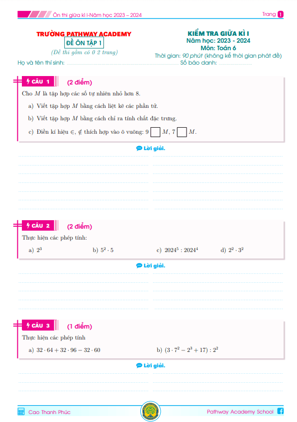 04 đề ôn tập giữa kì 1 Toán 6 năm 2023 – 2024 trường Pathway Academy – TP HCM