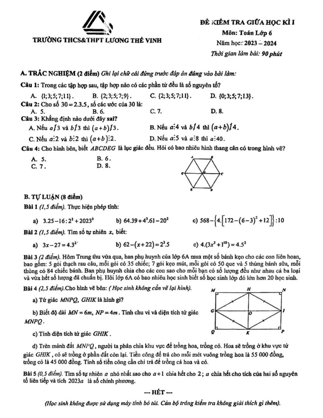 Đề giữa học kì 1 Toán 6 năm 2023 – 2024 trường Lương Thế Vinh – Hà Nội