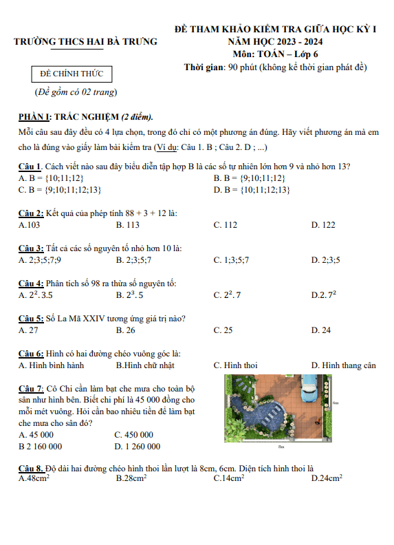 Đề tham khảo giữa kỳ 1 Toán 6 năm 2023 – 2024 trường THCS Hai Bà Trưng – TP HCM