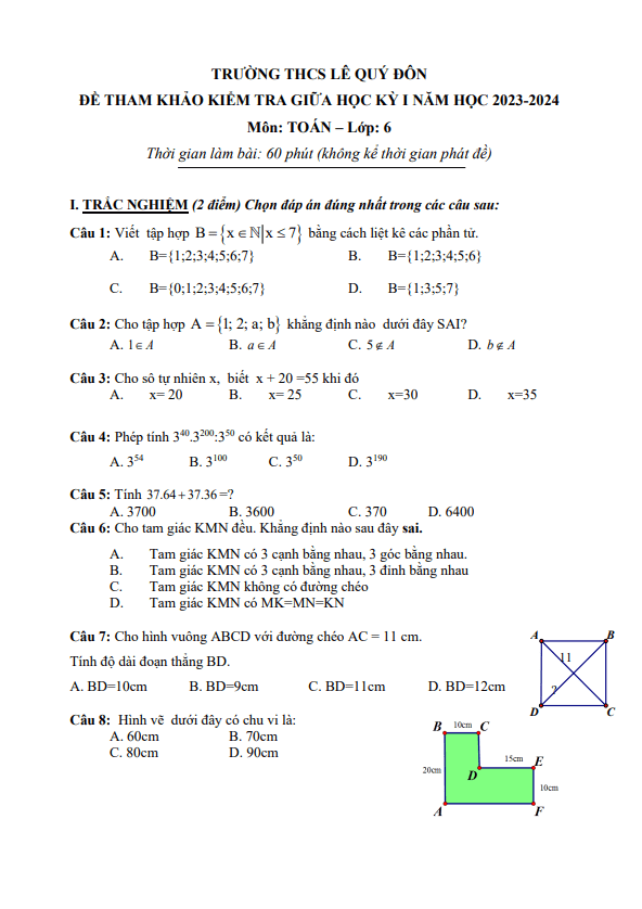 Đề tham khảo giữa kỳ 1 Toán 6 năm 2023 – 2024 trường THCS Lê Quý Đôn – TP HCM