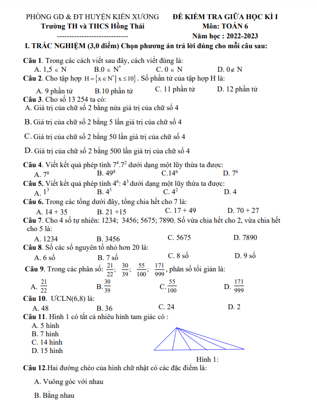 Đề giữa học kì 1 Toán 6 năm 2022 – 2023 trường Hồng Thái – Thái Bình