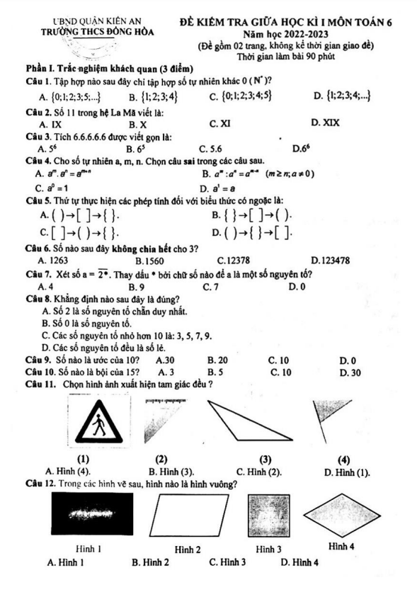 Đề giữa học kì 1 Toán 6 năm 2022 – 2023 trường THCS Đồng Hòa – Hải Phòng