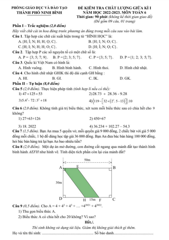 Đề giữa kì 1 Toán 6 năm 2022 – 2023 phòng GD&ĐT thành phố Ninh Bình