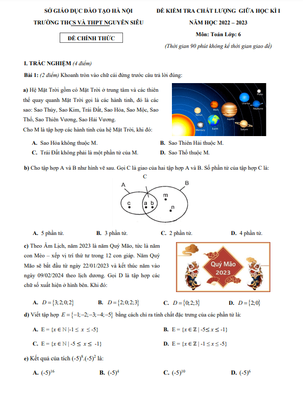 Đề giữa kì 1 Toán 6 năm 2022 – 2023 trường THCS&THPT Nguyễn Siêu – Hà Nội