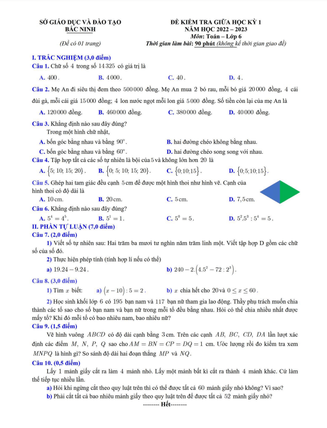 Đề kiểm tra giữa học kỳ 1 Toán 6 năm 2022 – 2023 sở GD&ĐT Bắc Ninh