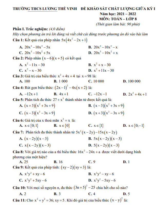 Đề giữa kỳ 1 Toán 8 năm 2021 – 2022 trường THCS Lương Thế Vinh – Nam Định