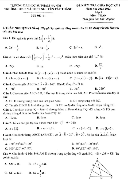 Đề giữa học kỳ 1 Toán 8 năm 2022 – 2023 trường Nguyễn Tất Thành – Hà Nội