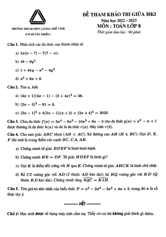 Đề tham khảo giữa HK1 Toán 8 năm 2022 – 2023 trường Lương Thế Vinh – Hà Nội