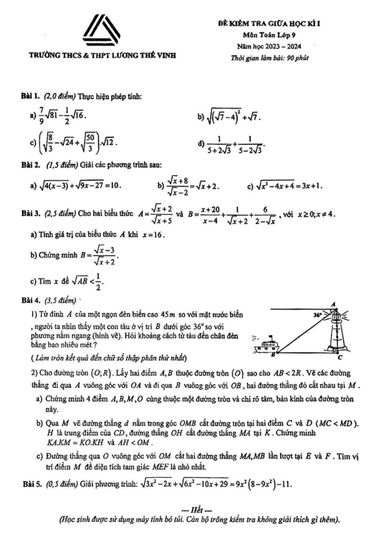 Đề giữa học kì 1 Toán 9 năm 2023 – 2024 trường Lương Thế Vinh – Hà Nội