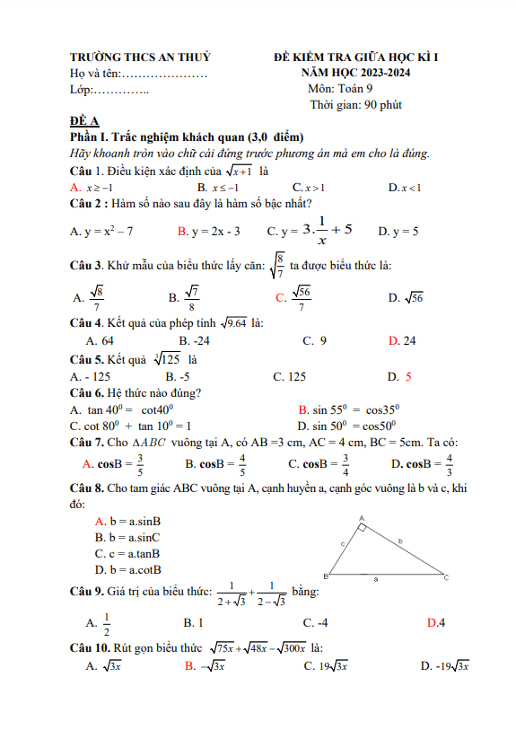 Đề giữa học kì 1 Toán 9 năm 2023 – 2024 trường THCS An Thủy – Quảng Bình