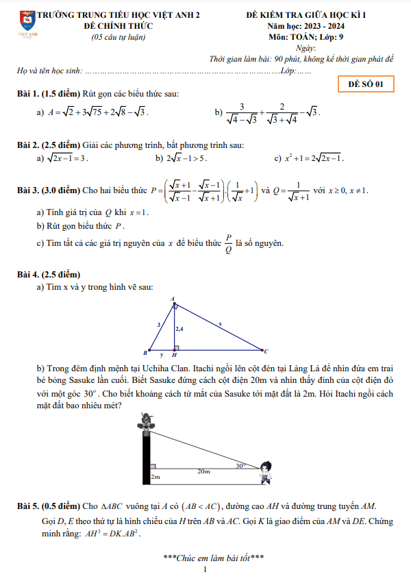 Đề giữa học kì 1 Toán 9 năm 2023 – 2024 trường Việt Anh 2 – Bình Dương