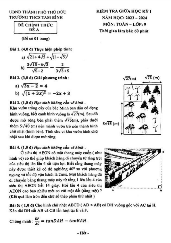 Đề giữa kỳ 1 Toán 9 năm 2023 – 2024 trường THCS Tam Bình – TP HCM